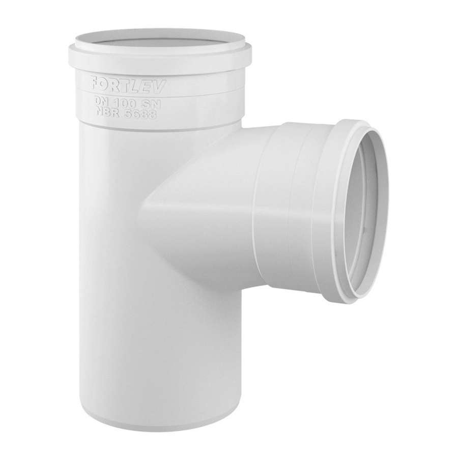 O Tê Esgoto SN Fortlev é fabricado em PVC na cor branca e projetado para escoamento em regime não contínuo à temperatura máxima de 45°C.